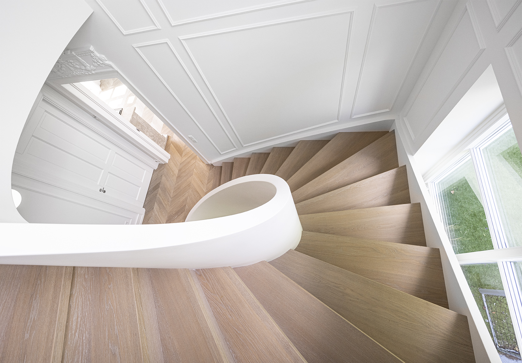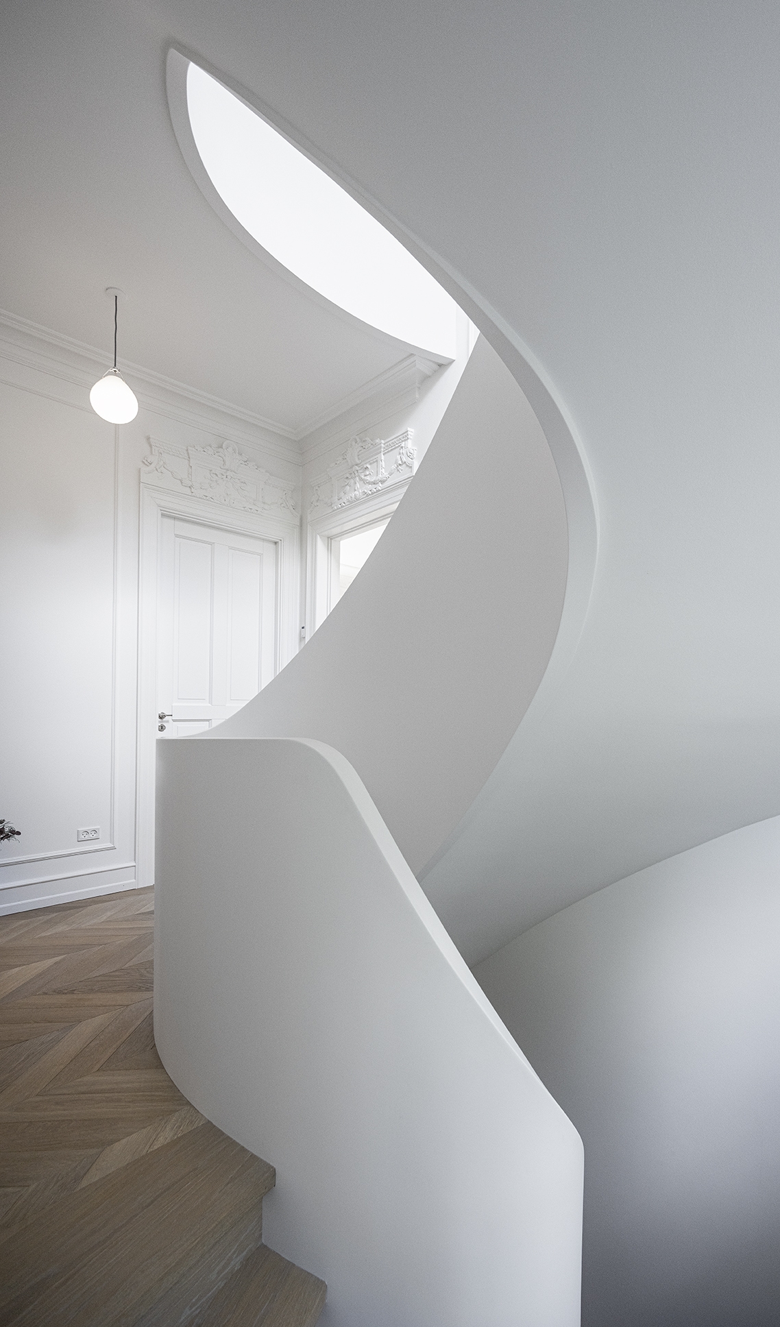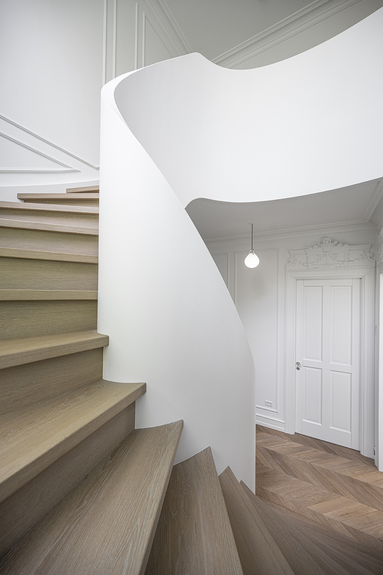 Classic panelled staircase in a renovated villa located in a seaside district of Copenhagen. The stairs connect three floors and are built around an elliptical balustrade. Made of oak, finished with oil.