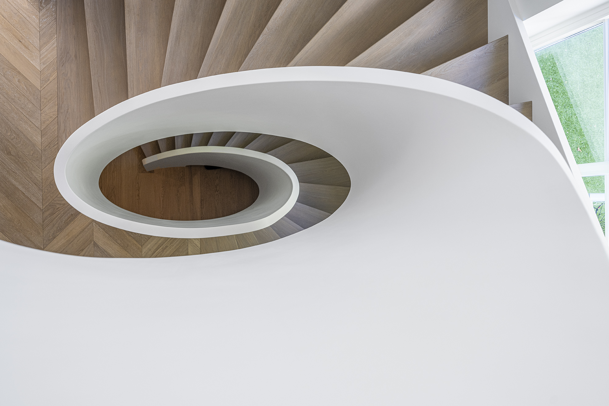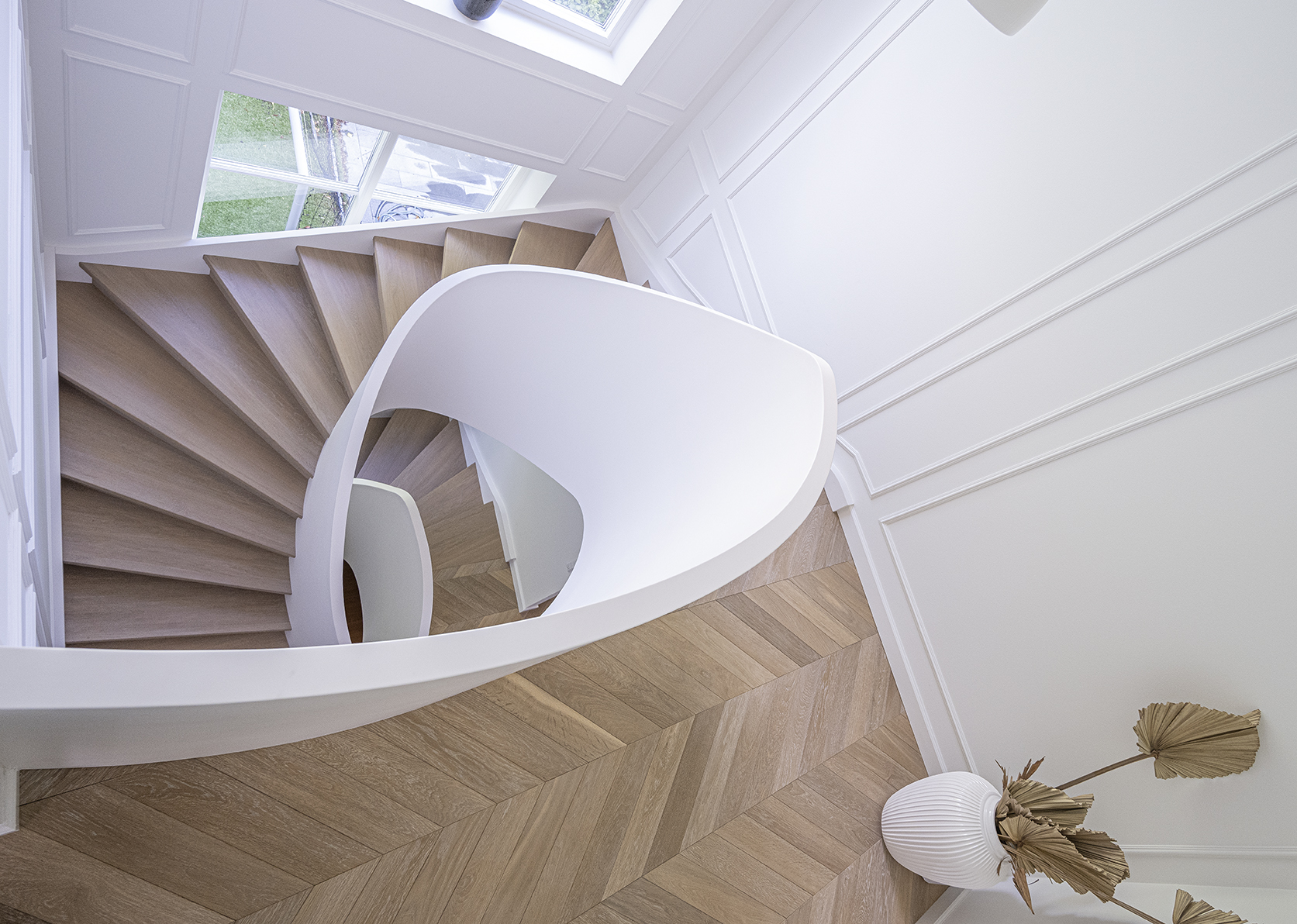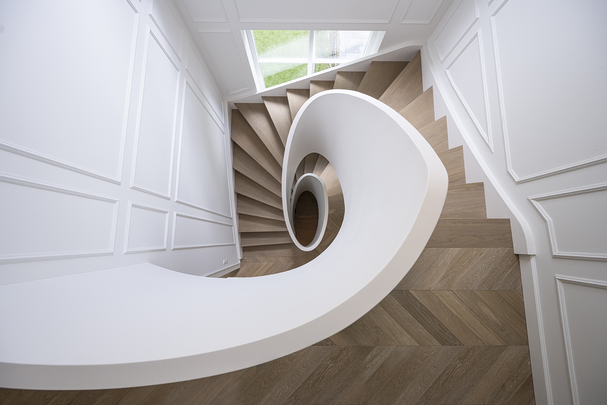 Classic panelled staircase in a renovated villa located in a seaside district of Copenhagen. The stairs connect three floors and are built around an elliptical balustrade. Made of oak, finished with oil.