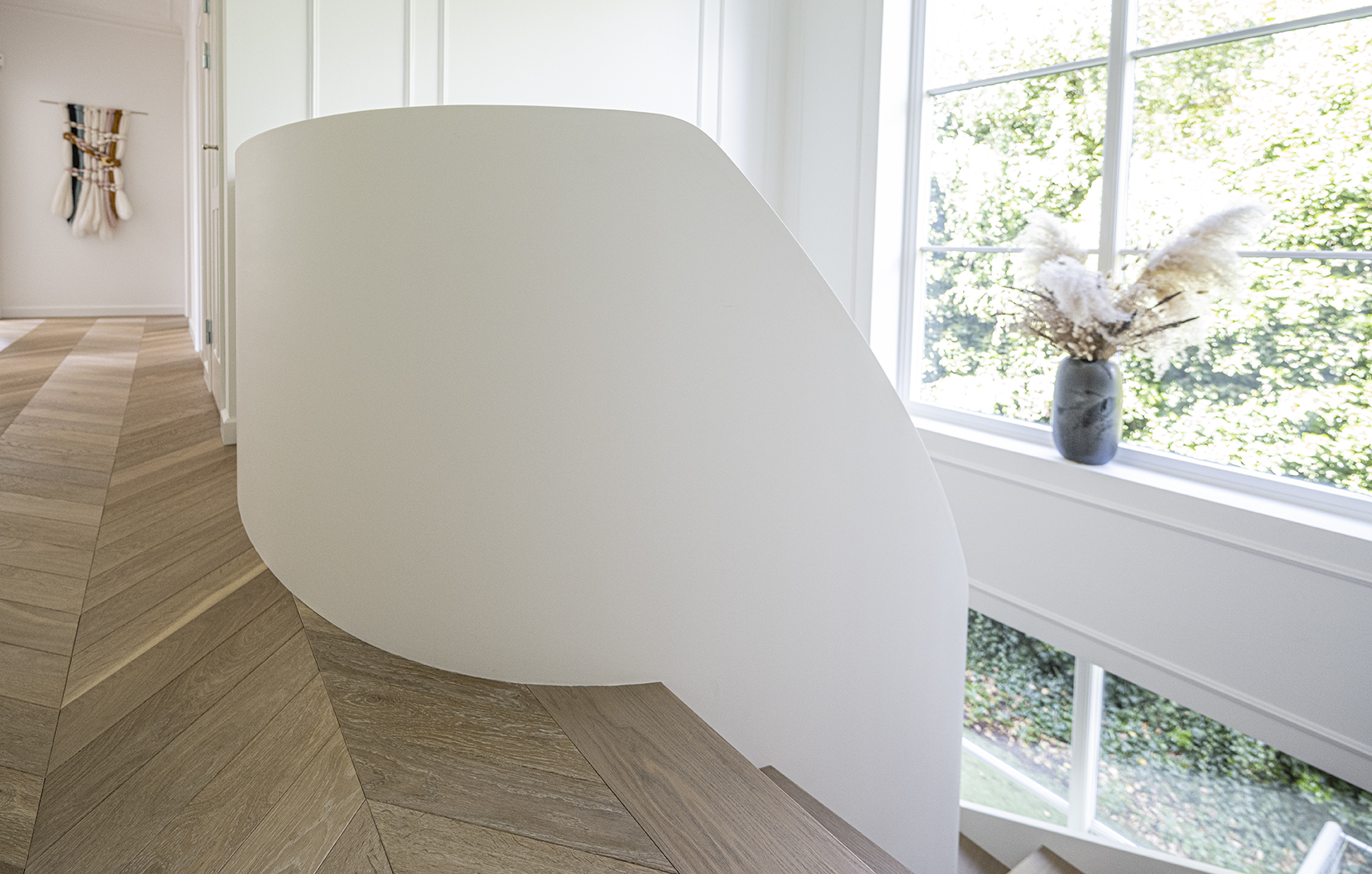Classic panelled staircase in a renovated villa located in a seaside district of Copenhagen. The stairs connect three floors and are built around an elliptical balustrade. Made of oak, finished with oil.